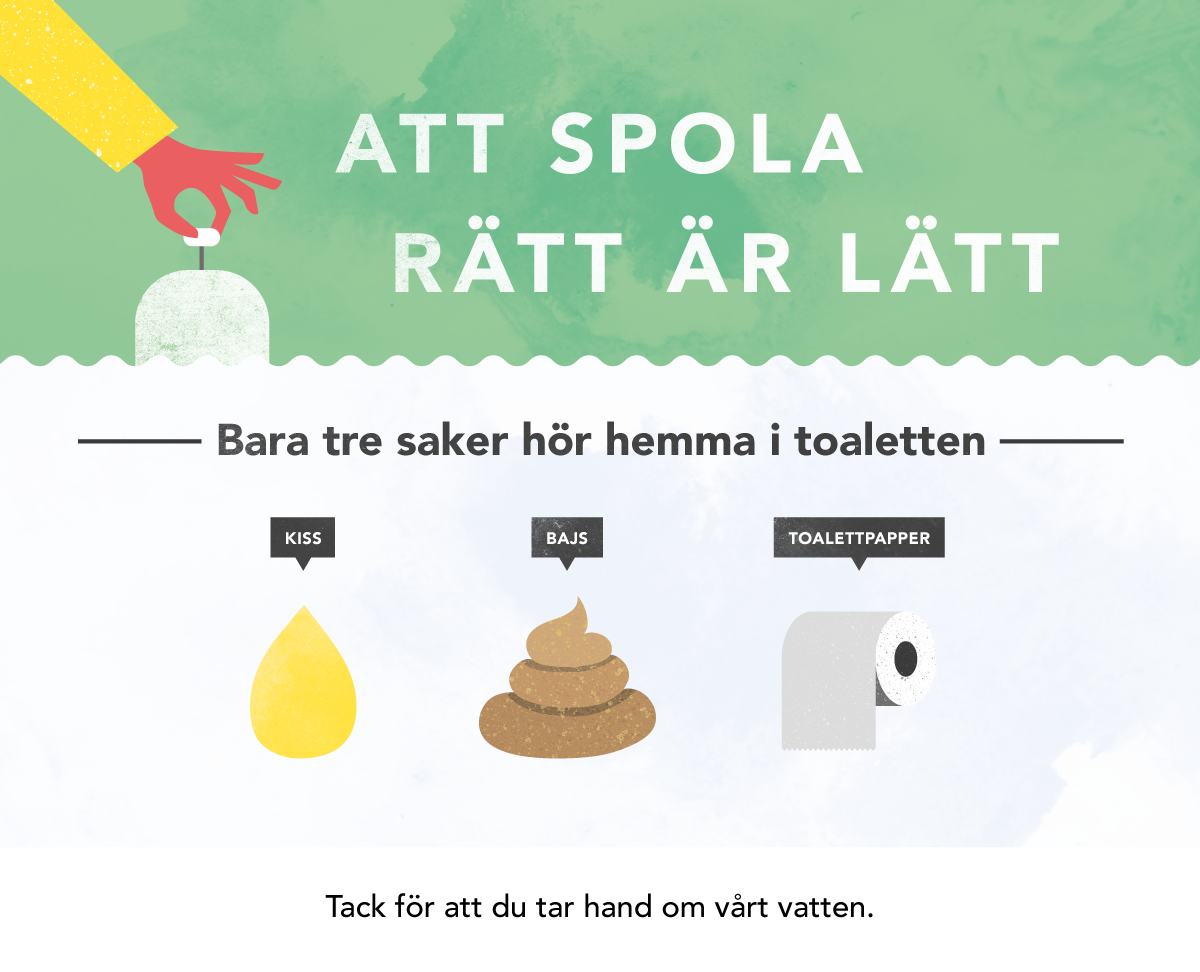 Har du koll på vad du får spola ner i toaletten? Det är endast kiss, bajs och toalettpapper som hör hemma där. Hushållspapper, våtservetter, bomullstops, bindor och allt annat skräp som spolas ner orsakar stopp i ledningsnät, pumpar och reningsverk.