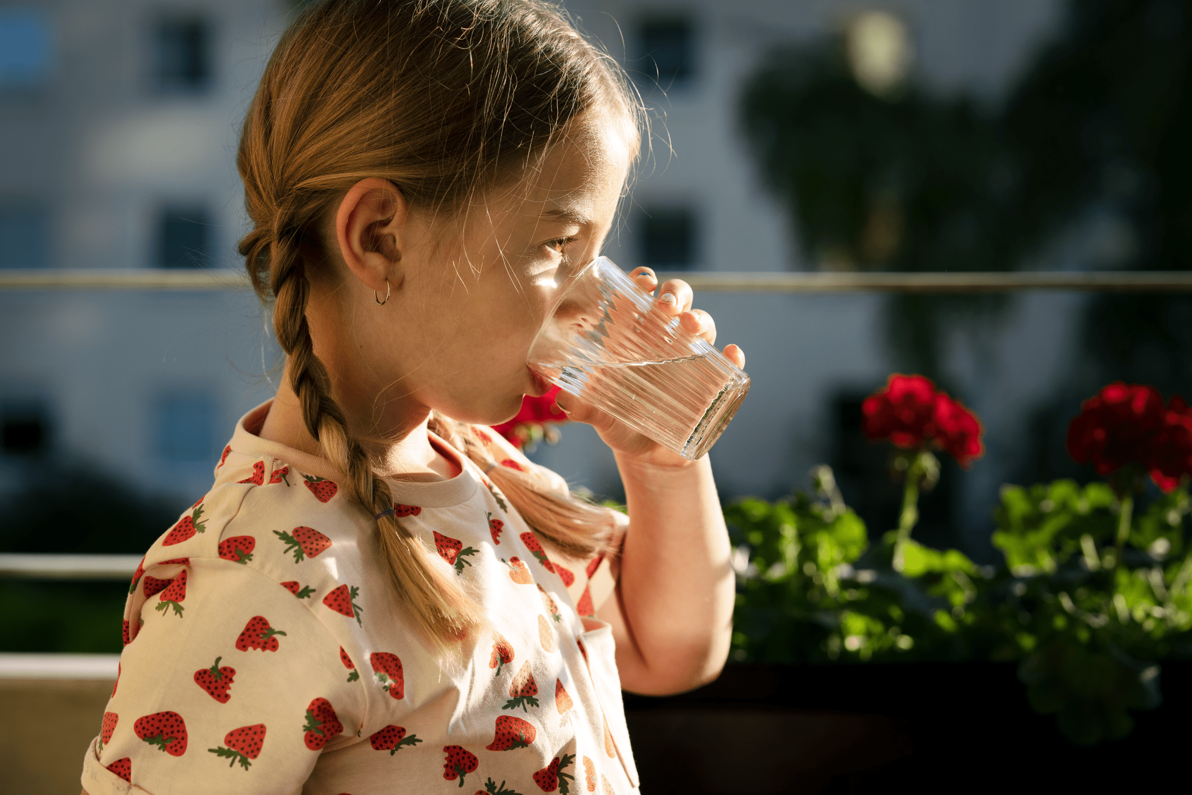 #Syntolkning En pyjamasklädd flicka med långa flätor står på sin balkong och dricker ett glas vatten.